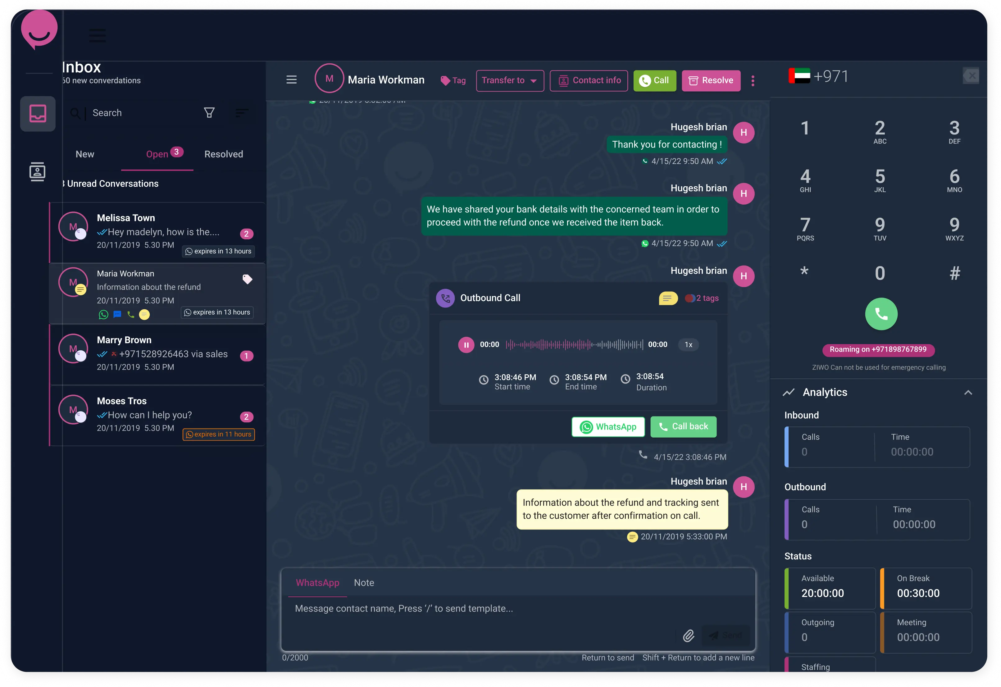 جميع المحادثات الصوتية ومحادثات الواتساب في مكان واحد، مع سجّل كامل لبيانات العملاء.
